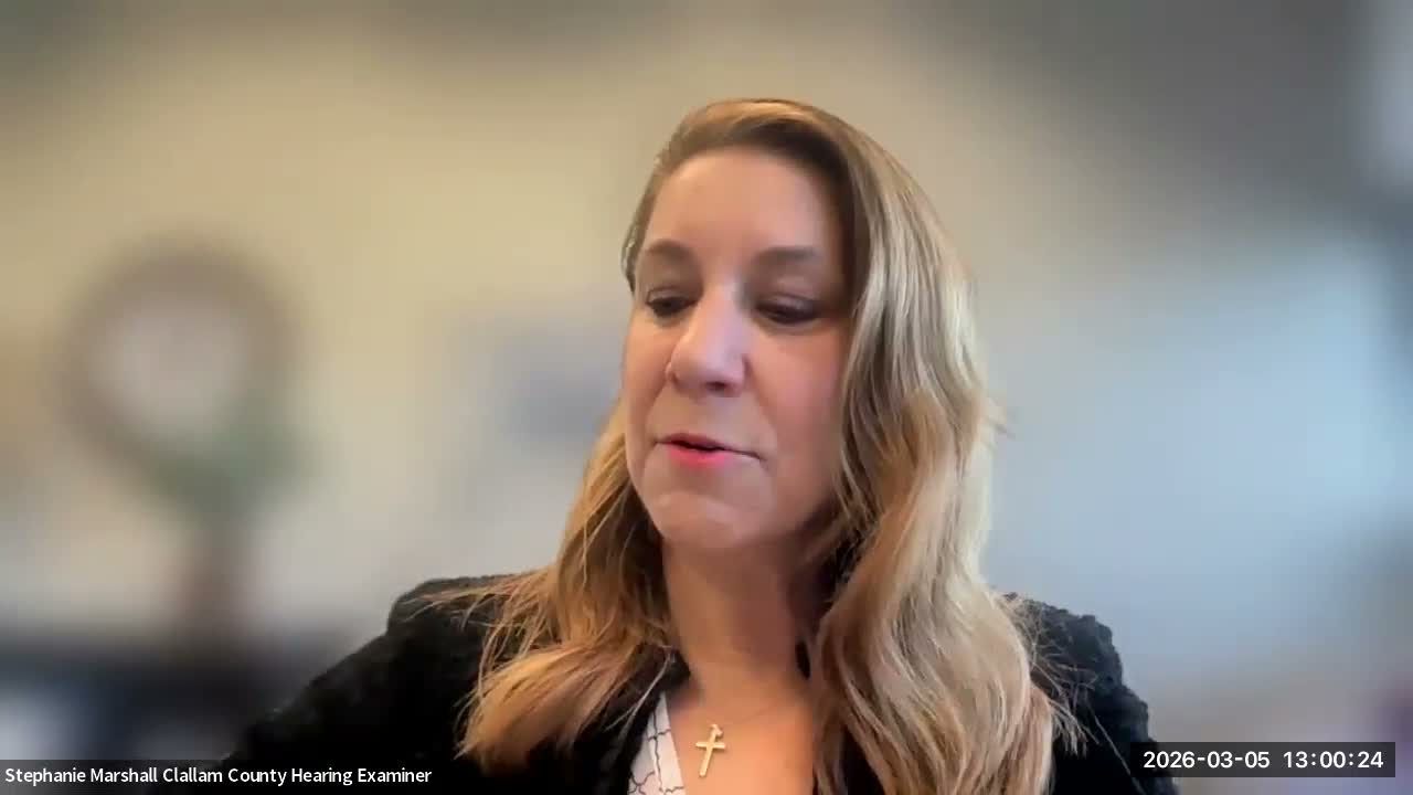 At a March 5 hearing, Clallam County planning staff recommended approval of a variance to cross a Category 3 wetland for driveway and utility access to a proposed single‑family dwelling; staff and the applicant described mitigation and agency consultations, the public offered no testimony, and the hearing examiner closed the record and will issue a written decision within 10 business days.
