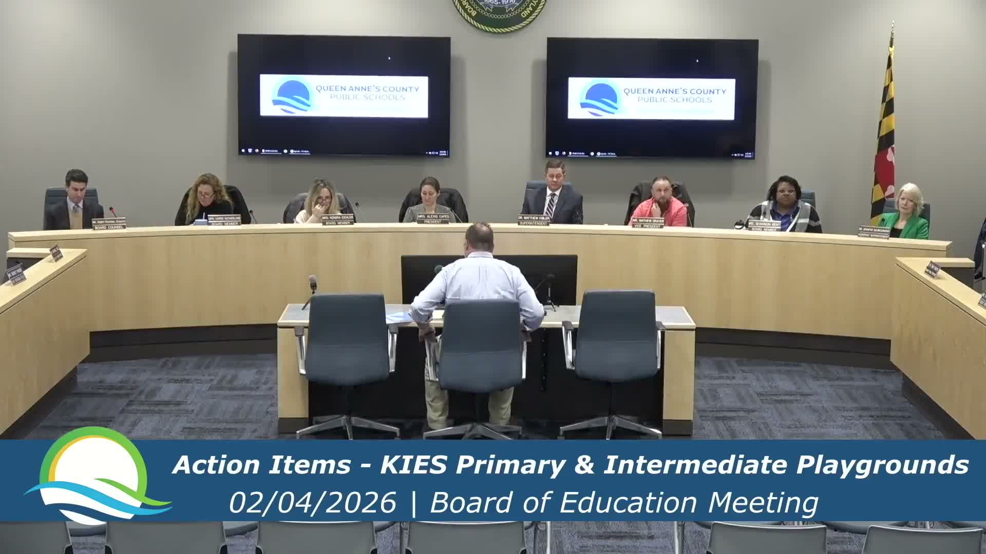 Daryl Bariclo, supervisor of facilities and design, presented a design‑charrette selection for Kent Island Elementary School playgrounds and recommended GameTime operating as Cunningham Recreation as the top scorer; the board approved the award (fiscal impact provided on the agenda) by voice vote. Bariclo then outlined a requested internal capital budget transfer of $40,000 from the Queen Anne's County High School roof project to the Kent Island Elementary fire alarm replacement project to increase the budgeted amount to $400,750. The board approved the internal transfer and then voted to award the fire alarm replacement to Johnson Controls (sole source for system continuity) with Liewood as the low electrical installer; total materials and installation cost stated as about $397,557.10 using FY25 local and state funds.