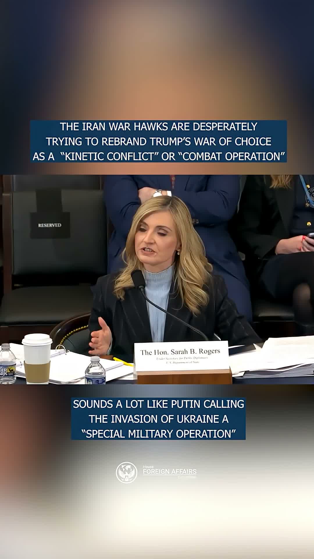 The witness defended describing the situation as a "kinetic conflict," saying other terms such as "armed conflict" or "violent conflict" could also apply. The congresswoman drew an analogy to Russia's early phrasing of the invasion of Ukraine as a "special military operation," saying such labels can obscure the reality of casualties and the scope of military action.