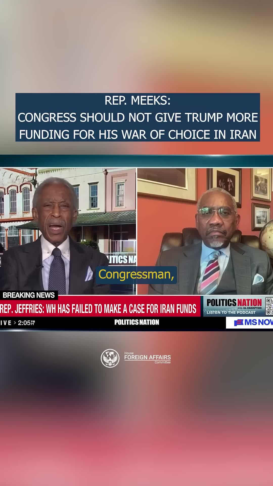 Responding, the congressman said, "We should not approve the funding. There has not been a plan." He criticized the administration for failing "to talk about what the endgame plan is" and for not disclosing "what the cost is," saying those omissions mean Congress should not continue to fund what he characterized as a "war of choice." He added, "I, for 1, would not vote for it, unless we get a plan."