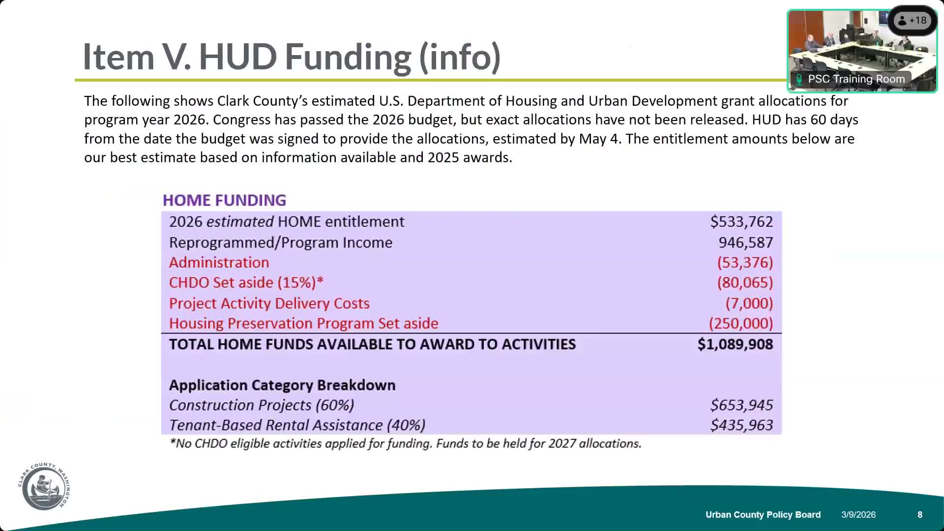 The Urban County Policy Board voted March 9 to forward staff-recommended allocations for program year 2026 Community Development Block Grant (CDBG) and HOME funds to the Clark County Council, endorsing a package that prioritizes housing preservation, tenant-based rental assistance (TBRA) and local asset and economic development.