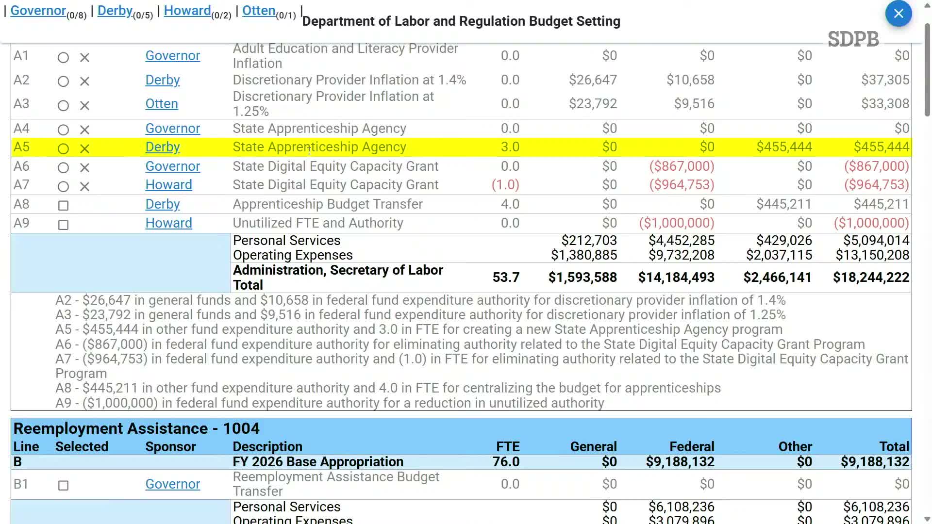 On the Department of Labor and Regulation agenda, the committee approved a motion to consolidate apprenticeship budget units and transfer associated authority (motion A8; roll-call result recorded as 14 ayes, 4 nays). A related motion (A5) to reclassify fund authority and reassign FTEs also passed (13 ayes, 5 nays). Committee approved related technical transfers (C2 and C3) by voice/roll call as presented.
