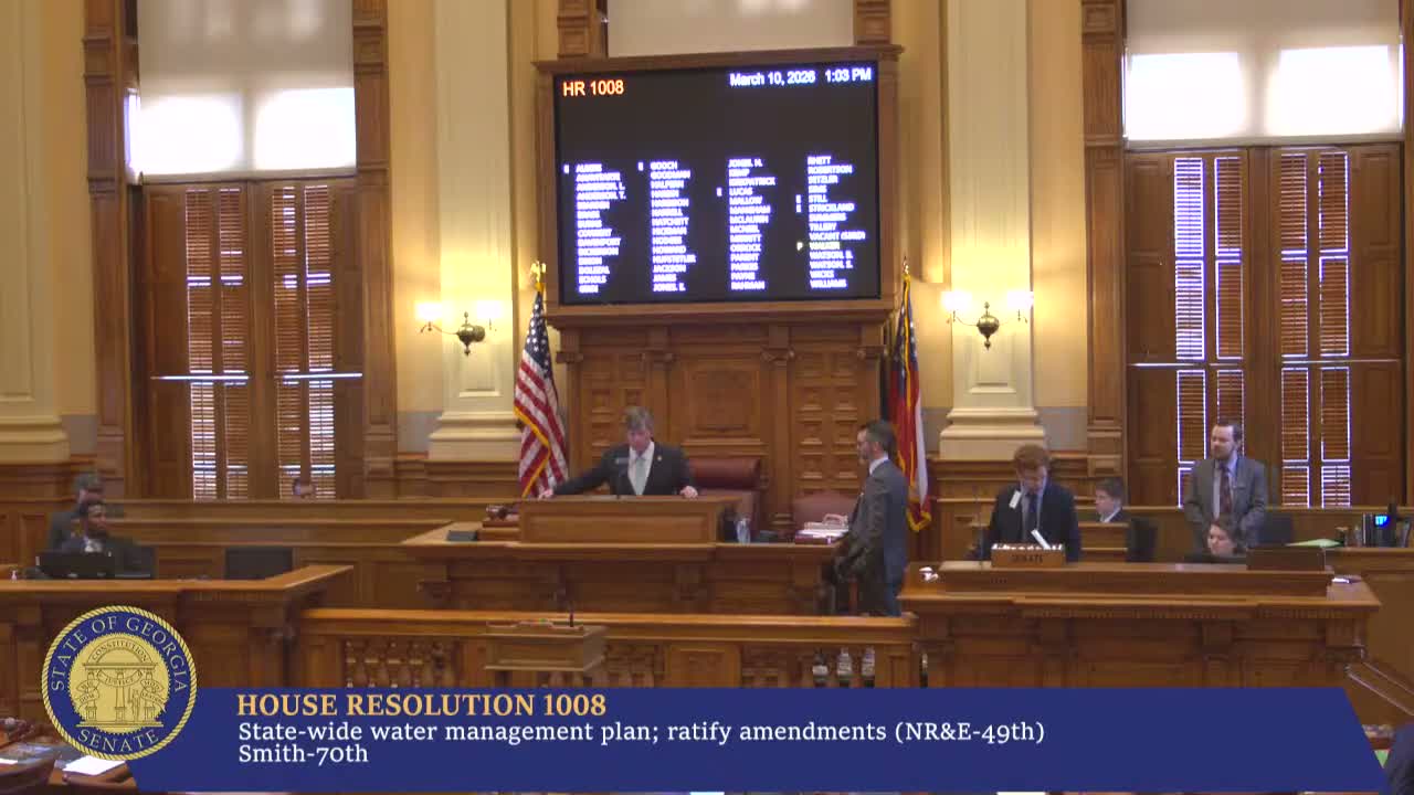 Key floor actions and recorded votes: - HR1008 (House Resolution 1008): The Senate adopted the resolution ratifying certain amendments to the State Water Plan, including changes to regional water council membership and terms. Vote recorded: yeas 43, nays 0. - HB 945 (House Bill 945): A banking & finance cleanup bill was presented and — after a contested set of floor amendments — passed the Senate 50–0 (see separate coverage). - HB 244 (House Bill 244): A substitute to HB244 (audits and accounting rules for local governments) was adopted by the Senate and the bill passed by substitute, ayes 48, nays 2. - HB 115 (House Bill 115): Legislation addressing abandoned vessels and DNR authority to remove or classify abandoned vessels was passed (yeas 51, nays 0). - SR 908 (Senate Resolution 908): A resolution honoring Abigail Savoy and calling attention to a dangerous intersection was adopted without objection; family members were present and recognized.