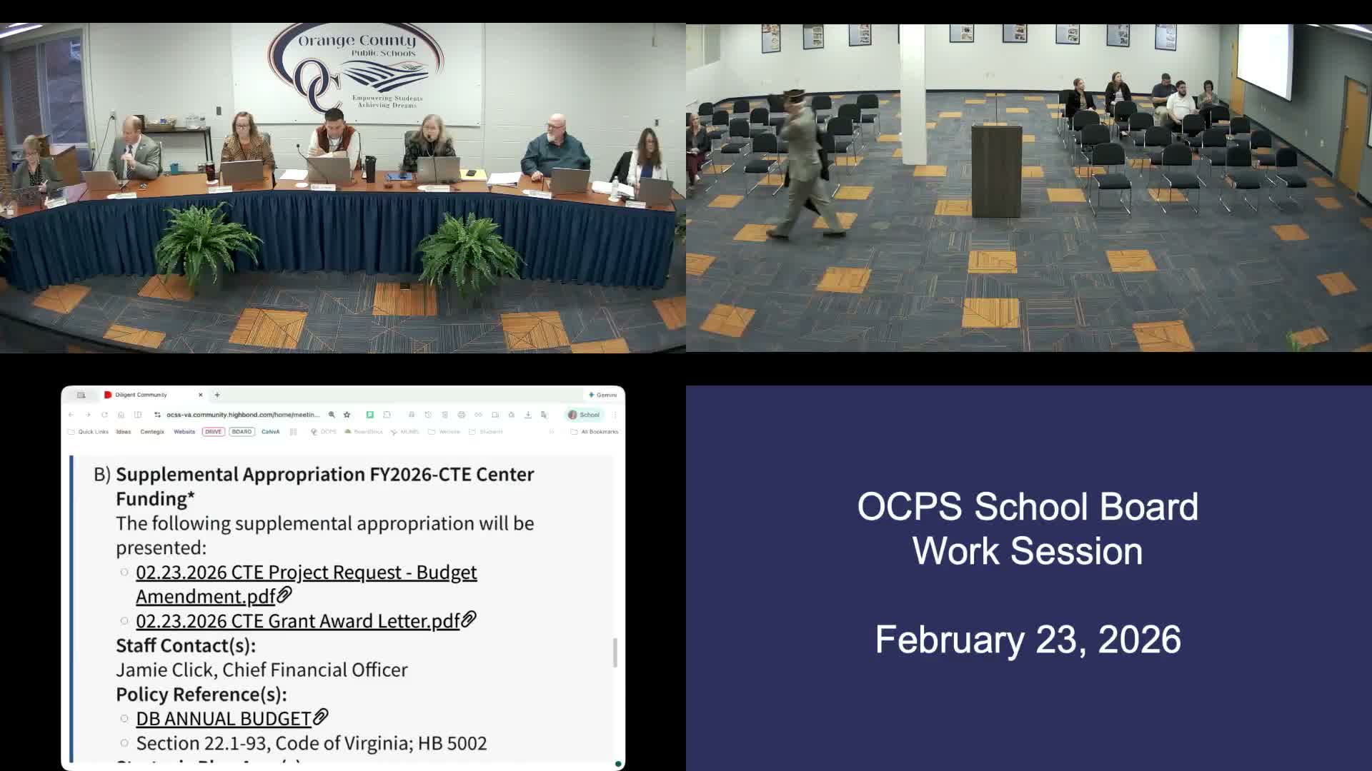 On capital planning, the board approved a FY2026 supplemental appropriation request that staff characterized as a placeholder of $23,000,000 to fund the Orange County High School CTE Center project. Doctor Hornick told the board that $2,200,000 of that placeholder comes from a School Construction Assistance Program grant awarded to the county; staff emphasized the figure is provisional and that a comprehensive agreement and final pricing remain to be determined before contracts are executed.