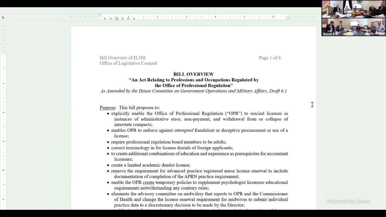 Legislative counsel Tim Dublin said the bill makes several cross-cutting changes—enabling OPR to rescind licenses in certain administrative-error or compact-withdrawal cases, requiring professional regulation board members to be adults, adjusting foreign-applicant terminology, and creating limited academic dentist licensure and changes to APRN renewal documentation. Dublin also said the bill requires OPR to report on whether speech-language pathology assistants should be regulated (a Sunrise review-style report) and dissolves an advisory committee on midwifery.