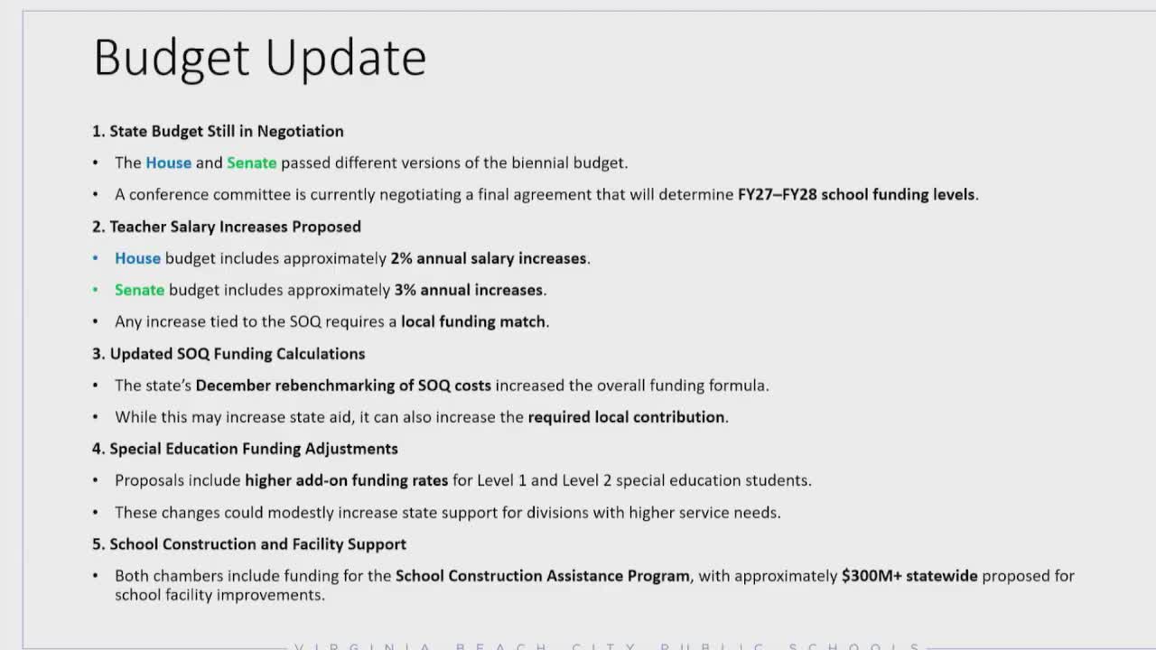 CFO Crystal Pate told the Virginia Beach School Board the House and Senate have passed competing budgets and conferees are reconciling differences; she flagged teacher compensation as a major unresolved issue and listed key dates for the conference report and subsequent city actions.