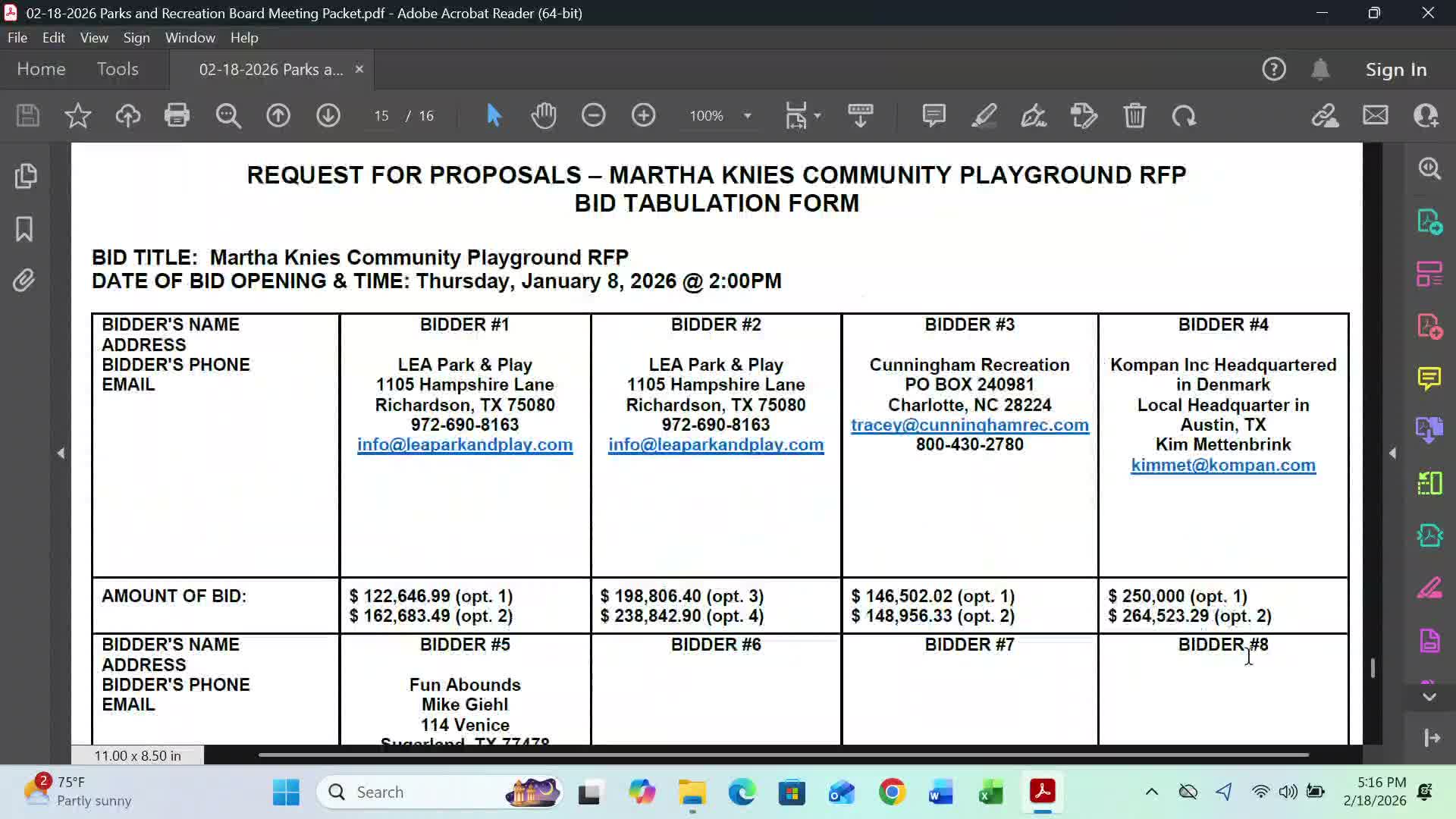 Staff presented five bids and noted that bidder #4 scored highest in the review process; the recommended package includes the play structure and a pour-in-place surface. The vendor advised a lead time for custom fabrication closer to 28 weeks, a staff member said, and confirmed that tariffs would not affect the price. A board member noted that some bids included rubber mulch and others included pour-in-place surfacing; members discussed tree-root impacts and long-term maintenance.