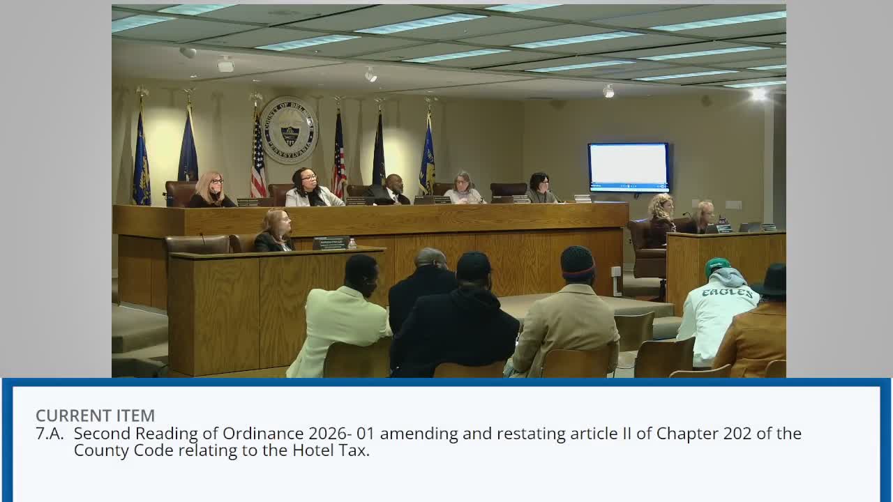 Delaware County Council voted Jan. 21 to adopt ordinance 2026‑01, increasing the county hotel‑occupancy tax to 5% and directing the restricted revenue to VisitDelco, the county’s designated tourism promotion agency.