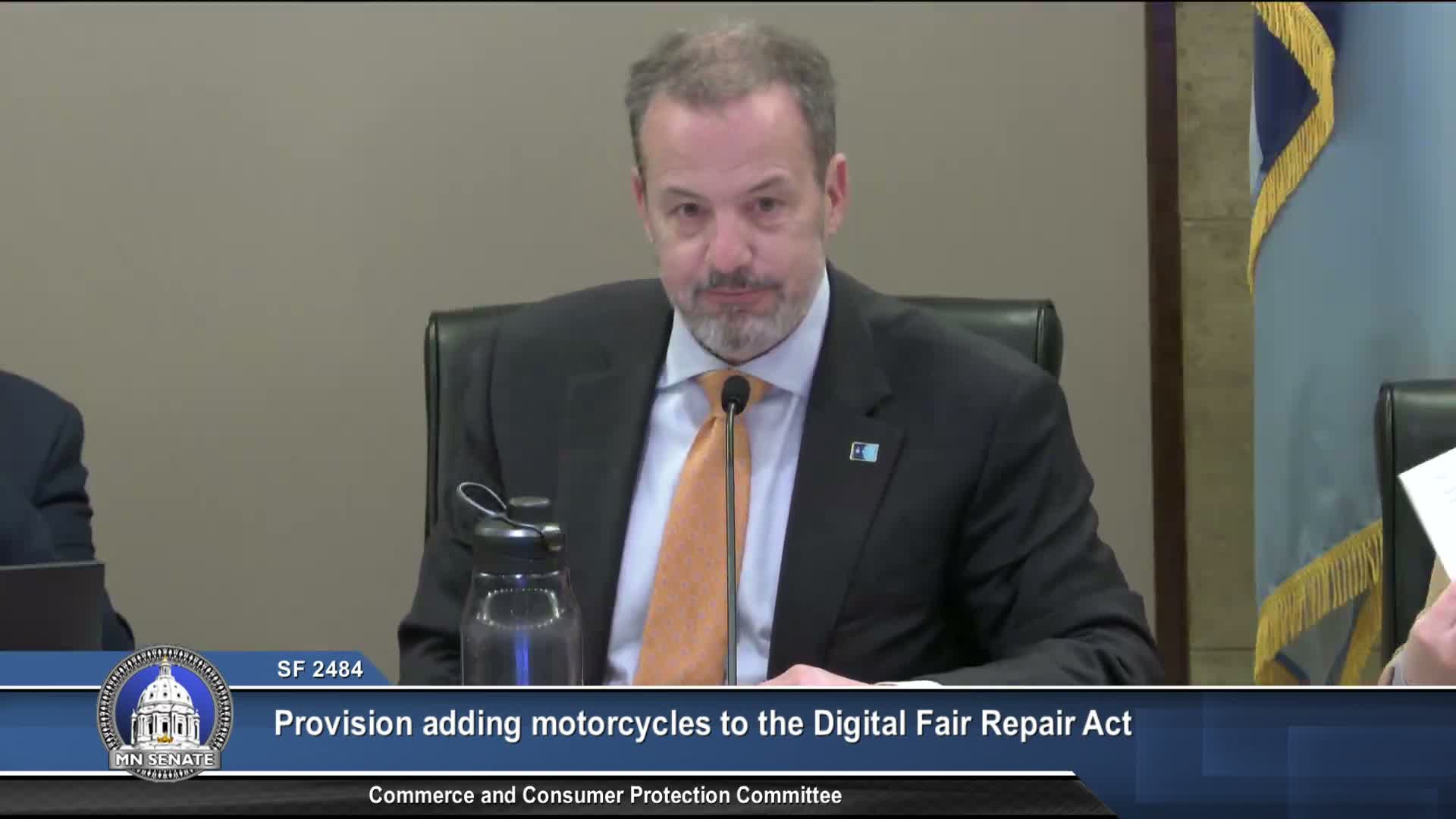 Senate File 2484, which would add motorcycles to Minnesota's Digital Fair Repair Act, drew sharply contrasting testimony on March 12, 2026, and was laid over by the Senate Commerce and Consumer Protection Committee for further consideration.
