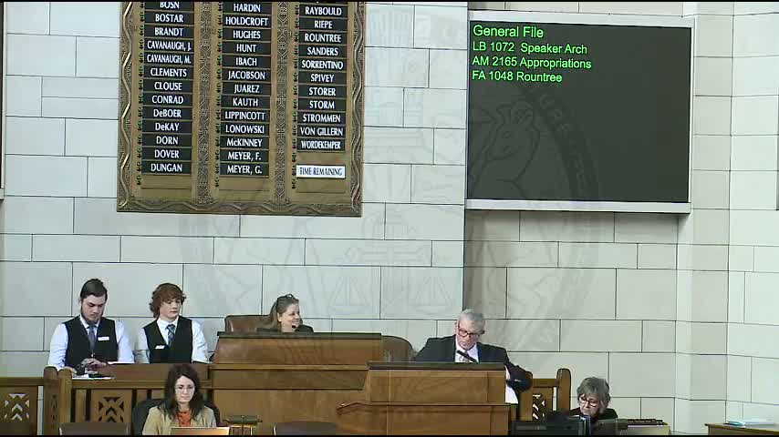 Senators engaged in a sustained floor debate over FA 10-48, a proposed floor amendment by Senator Rountree to prevent transfers from the Nebraska Veterans Aid Fund into other budget uses. The discussion featured personal constituent stories, data on the fund's balance and interest, and competing views on whether interest-only transfers could safely support veterans homes without reducing direct aid to needy veterans.