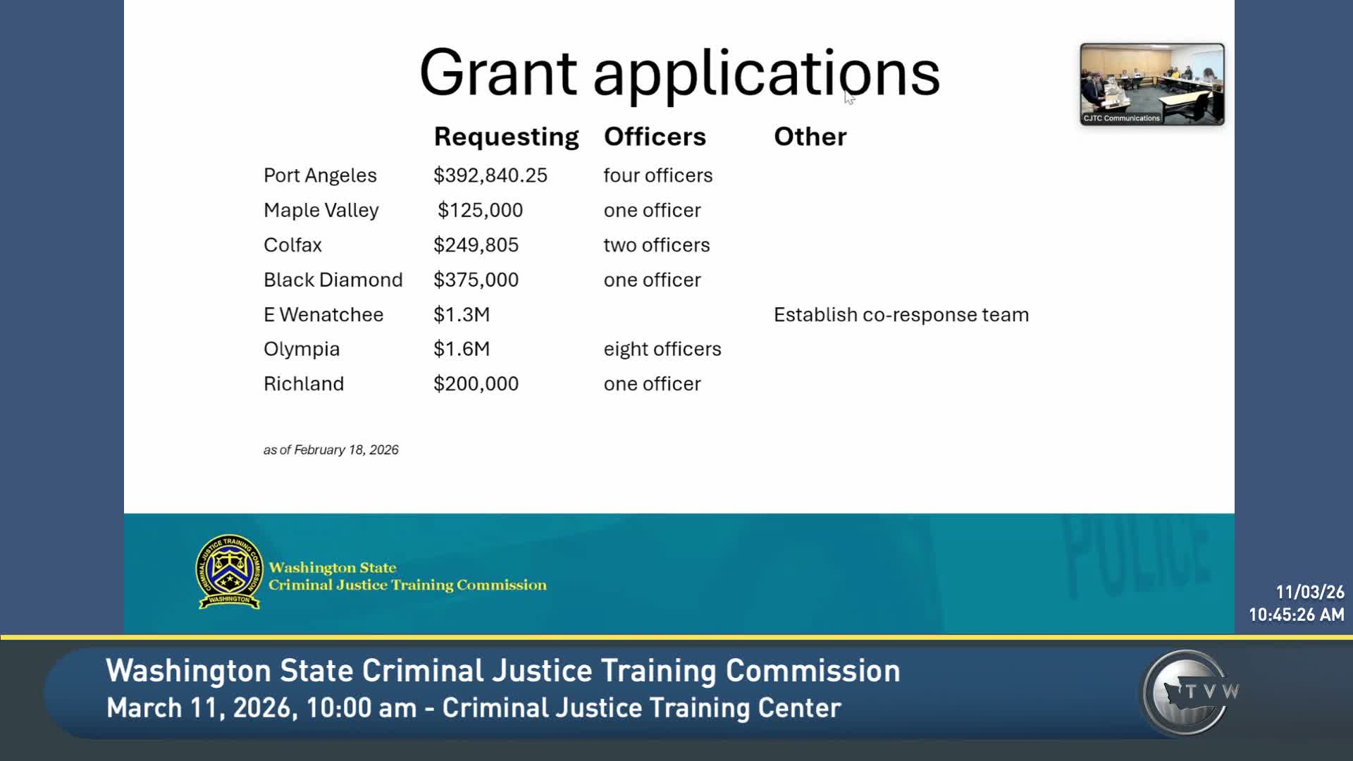 The Criminal Justice Training Commission heard a detailed update on Field Training Officer and Police Training Officer programs, including a new Washington model policy, acute instructor shortages after contracting changes, funding limits for courses and plans for apprenticeship and video-based training to improve consistency.