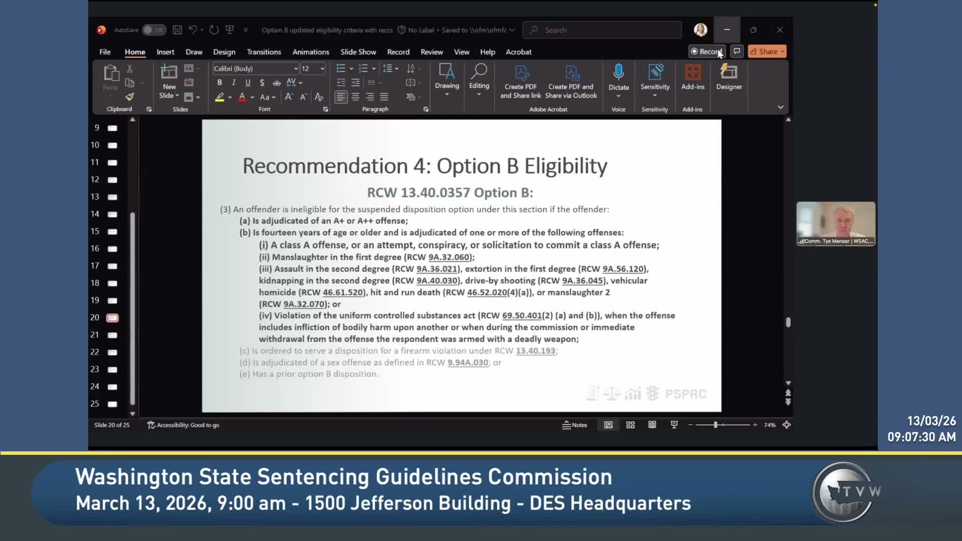 On March 13, 2026, the Sensing Guideline Commission voted to adopt a juvenile committee recommendation to allow judges discretion to apply Option B to Assault II adjudications for youth aged 14 or older; the motion passed 7–3 with 6 abstentions after lengthy debate over discretion, court enforceability and available services.