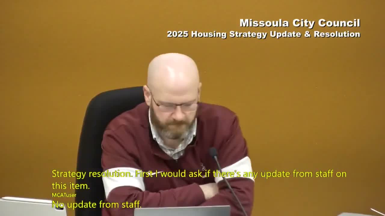 The Missoula City Council on March 3 adopted an updated housing strategy, "A Place to Call Home 2025," by a 10–1 roll-call vote after rejecting an amendment that would have removed consideration of a ballot initiative as a funding tool.