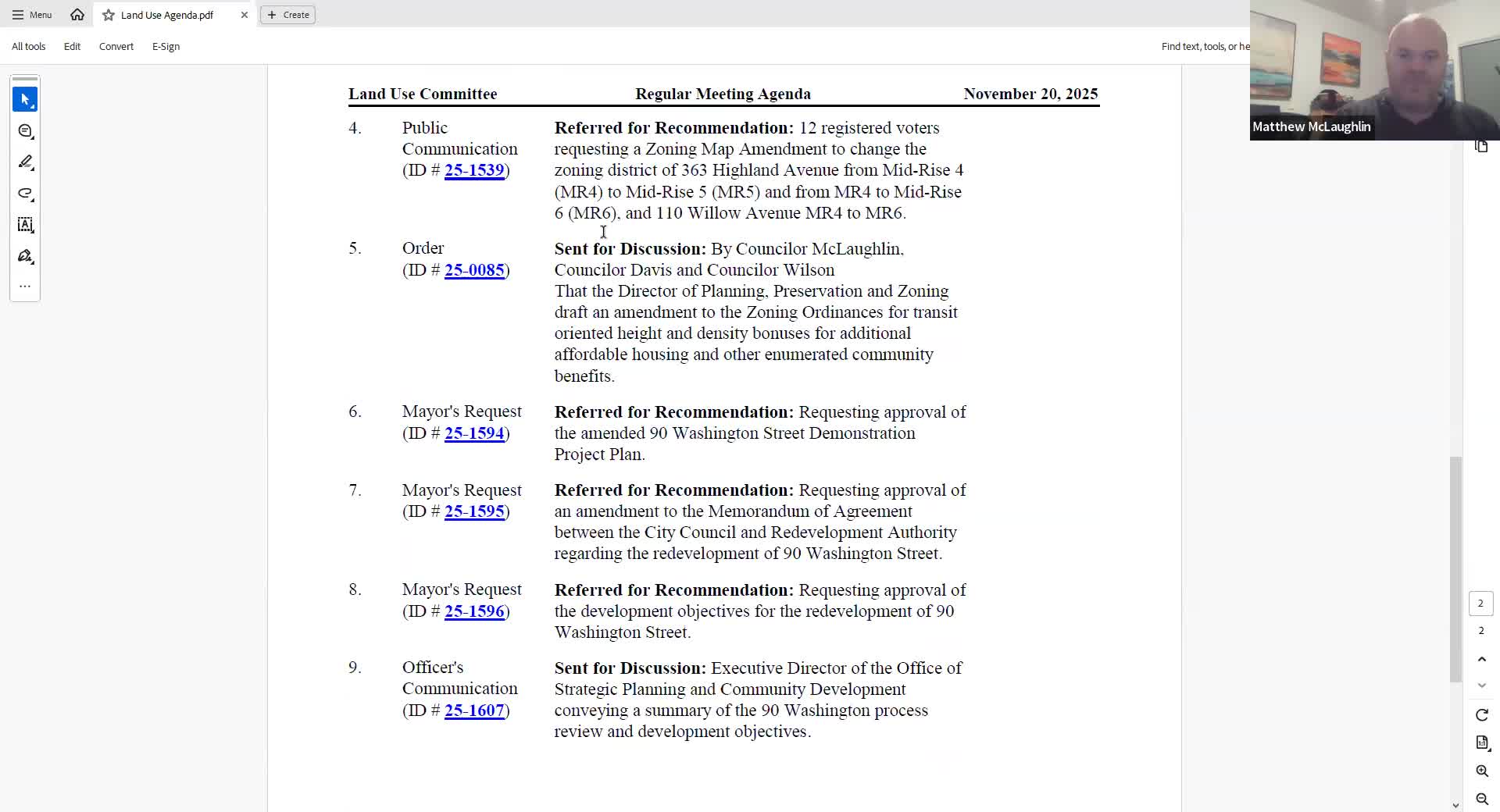 The Land Use Committee considered a citizen petition requesting a zoning map amendment for 363 Highland Ave (from MR4 to MR5/MR6) and 110 Willow Ave (from MR4 to MR6). Councilor Davis recused himself from the Highland properties, citing an identified conflict.