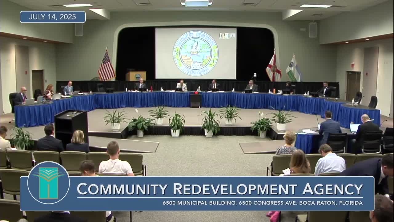 The Community Redevelopment Agency of Boca Raton voted 5‑0 on July 14 to approve DDRI/IDA application CRP 2401 (Modera Boca), a proposed 12‑story, 306‑unit multifamily project at 400 South Dixie Highway, as amended to require an 8‑foot sidewalk along Dixie.