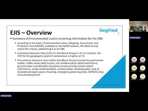 Key findings presented - Emissions: Fissler reported 2024 actual emissions of roughly 9 tons per year of nitrogen oxides (NOx) and about 11 tons per year of volatile organic compounds (VOCs). He said the Title V permit has higher allowable limits (transcript cited roughly 26.2 tons/year of NOx and nearly 99 tons/year of VOCs), and that the facility’s actual emissions have been significantly lower than permit limits. - Particulate matter: The presenters described Siegfried as a minor source of fine particulate matter (PM2.5), reporting about 2 tons/year of PM2.5 in recent years (well below the 100 tons/year threshold New Jersey uses to identify significant PM sources). - Other stressors: The EJ screening results listed a mix of 12 stressors in the block group, including fine particulates, heavy truck traffic, soil and groundwater contamination indicators in the block group (not necessarily at the Siegfried site), surface-water and drinking-water impacts, lack of recreational open space, and unemployment. - Permits and controls: The presentation said the site holds the Title V air permit, several stormwater permits, an industrial-wastewater discharge permit, sewer and sludge permits, water allocation and water-use registration permits, hazardous-waste-generator status, and a small X-ray/radiation permit for quality-control lab work. Presenters said routine inspection, monitoring and pollution-prevention plans are in place and that the renewal will not increase discharges or change emergency planning or permit conditions.