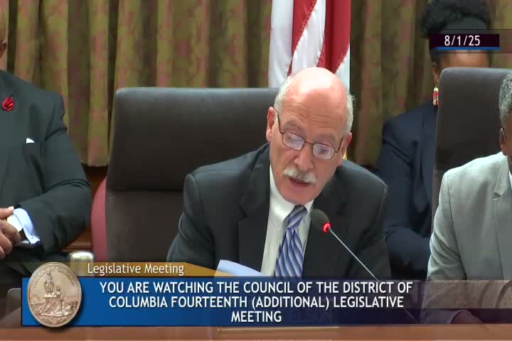 Phil Mendelson, Chair of the Council of the District of Columbia, presided over a special legislative meeting on Aug. 1, 2025, at Room 500 of the Johnny Wilson Building and announced that the Council would consider Bill 20 six-two 88, the Robert F. Kennedy Campus Redevelopment Act of 2025. The bill had been reported out of the Committee on Business and Economic Development and earlier by the Committee of the Whole.