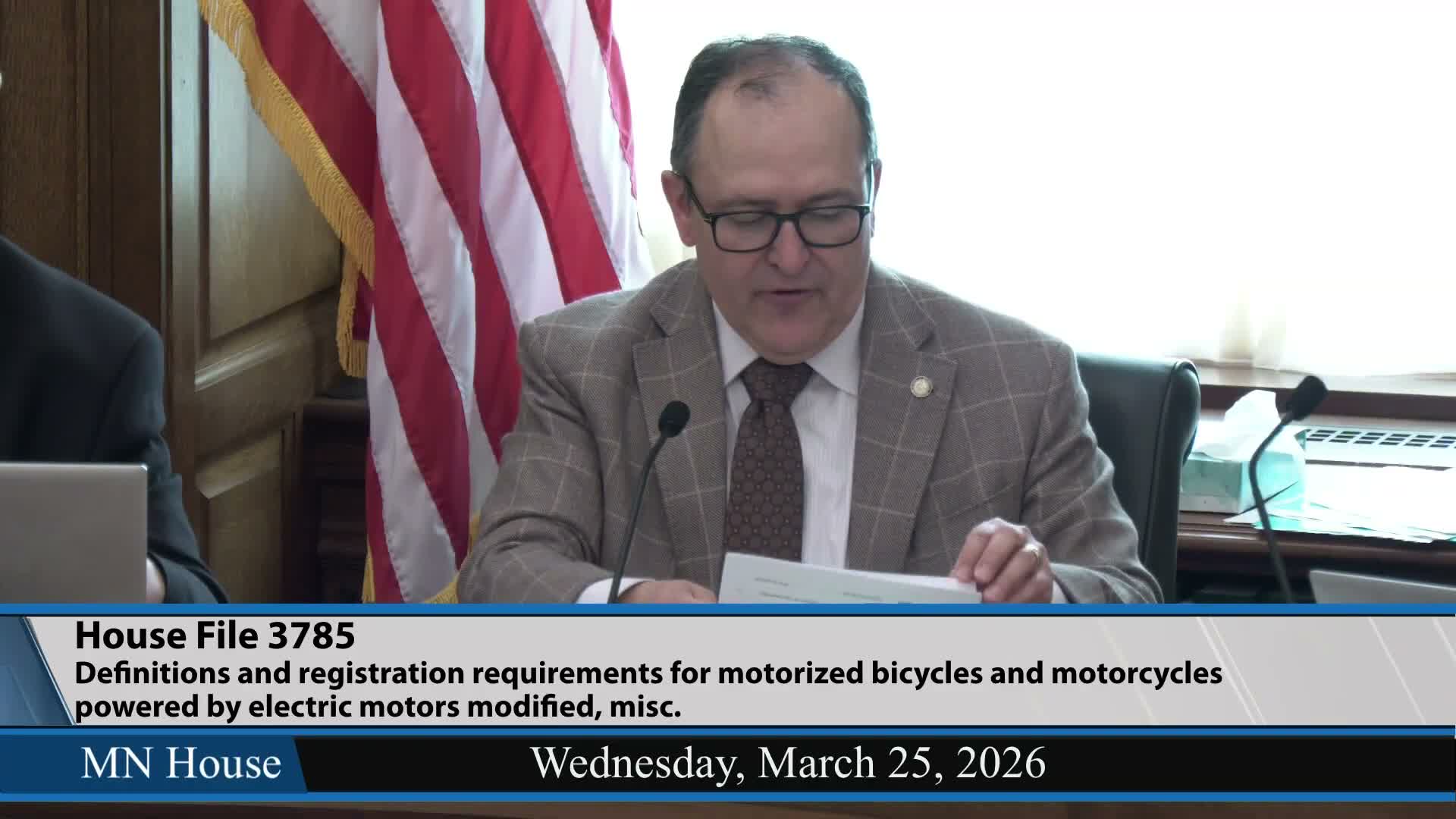 Lawmakers advanced H.F. 3785 to Ways and Means after author amendments were adopted to classify high‑power electric motorcycles as motorcycles, require certification similar to gasoline motorcycles, and create a >1,500‑watt category; stakeholders including the Amateur Rider Motorcycle Association said recent author amendments addressed many concerns.