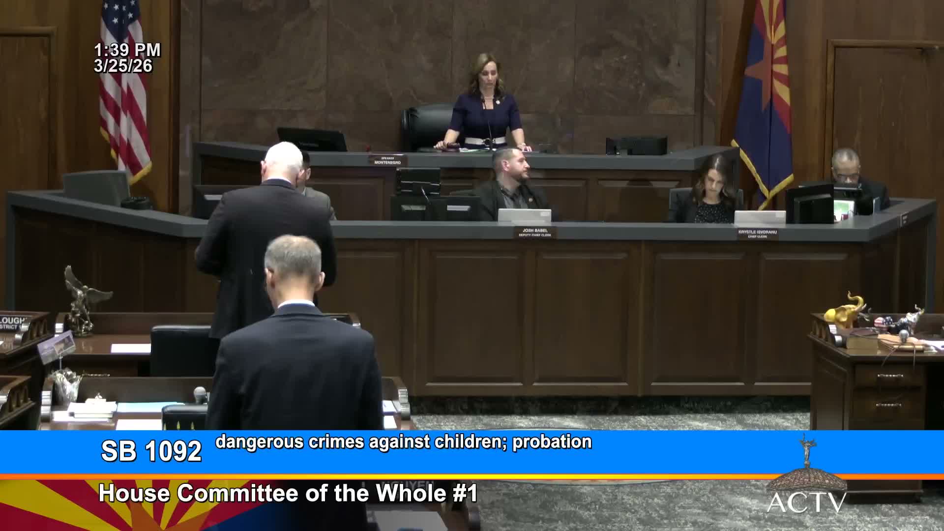The Arizona House Committee of the Whole reported several Senate bills — including a judiciary bill removing probation for dangerous crimes against children (SB 1092) and appropriations and government committee bills — recommending them 'do pass' and referring them to engrossing.