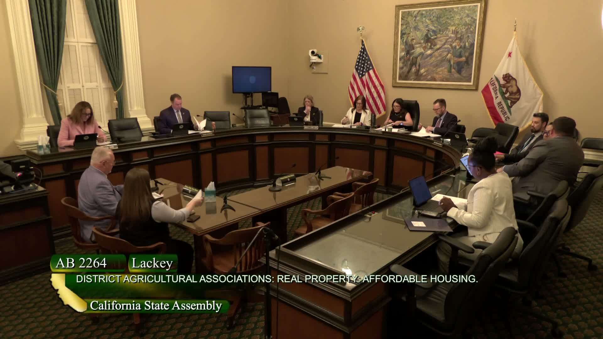 AB 22 64 (Assemblymember Lackey) would allow district agricultural associations that manage fairgrounds to lease property for longer terms — increasing lease options from 55 to 99 years — to support affordable housing projects; the city of Del Mar spoke in favor and the committee sent the bill to Housing and Community Development.
