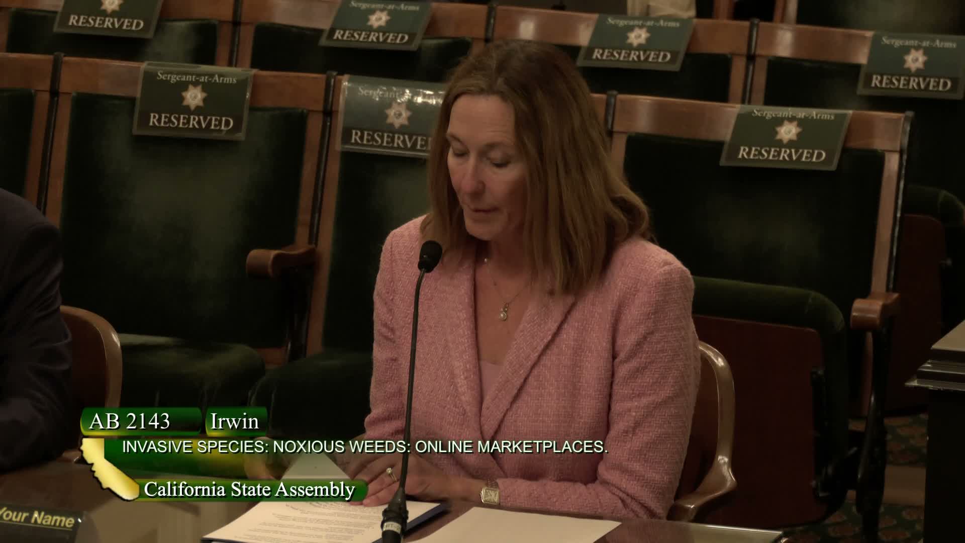 "AB 2143 addresses this issue by banning online marketplaces from accepting payment for noxious weeds that would be shipped to a delivery address within the state," Assemblymember Irwin told the committee.