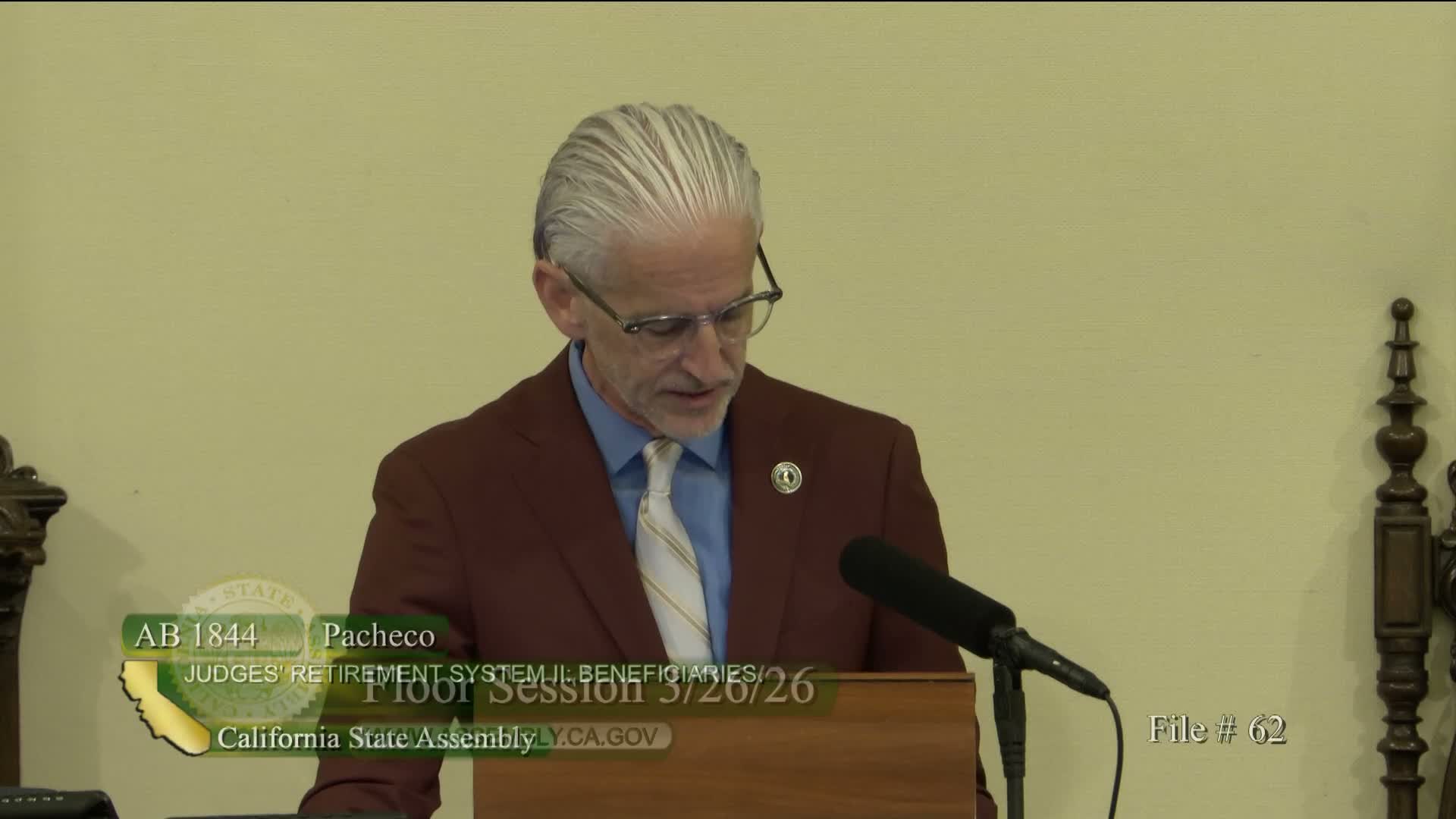 “AB 18 44 updates the Judge's Retirement System 2 or JRS 2 to allow judges to designate a non spouse beneficiary to receive survivor retirement benefits, and to ensure that all vested judges can access survivor benefit protections,” Assemblymember Pacheco said on the floor, explaining that under current law JRS 2 generally limits designation to a spouse or registered domestic partner and that unmarried judges, long-term partners and dependents could not be named to receive continuing pension payments.