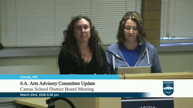 The board heard a first-year summary from the Arts Advisory Committee co-chairs, who described short-term goals, subcommittees for music and visual arts, and plans for a central Camas Arts website and calendar to increase community access to district arts events.