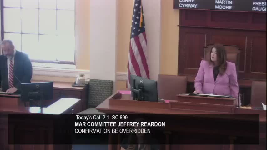- Nominations confirmed: Geoffrey Reardon (Manchester), Brian Raver (Falmouth), Dana Hammond II (Bristol) and Curtis Haycock (Millbridge) were confirmed to the Marine Resources Advisory Council following roll-call votes sustaining committee recommendations.