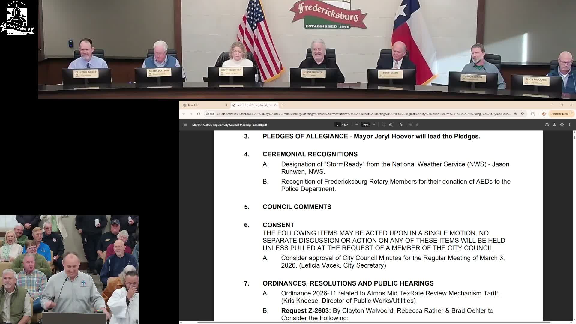 Fredericksburg and Gillespie County received a StormReady designation from the National Weather Service on the council dais, a recognition staff said underscores local investments in warning systems, emergency planning and public education.