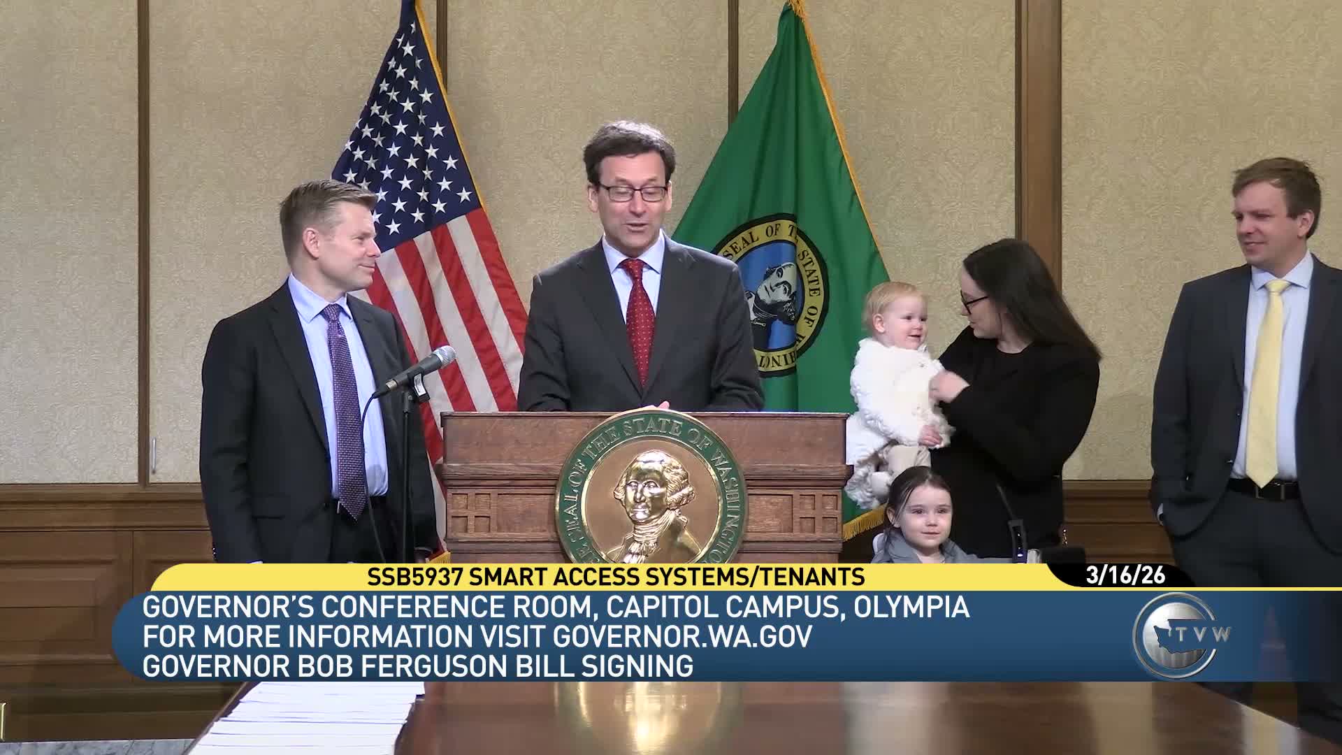 A presenter signed a package of roughly two dozen bills in a morning ceremony in Olympia, saying the measures — spanning tenant privacy, health-care administration, transportation safety and labor protections — were the product of bipartisan work and public engagement.