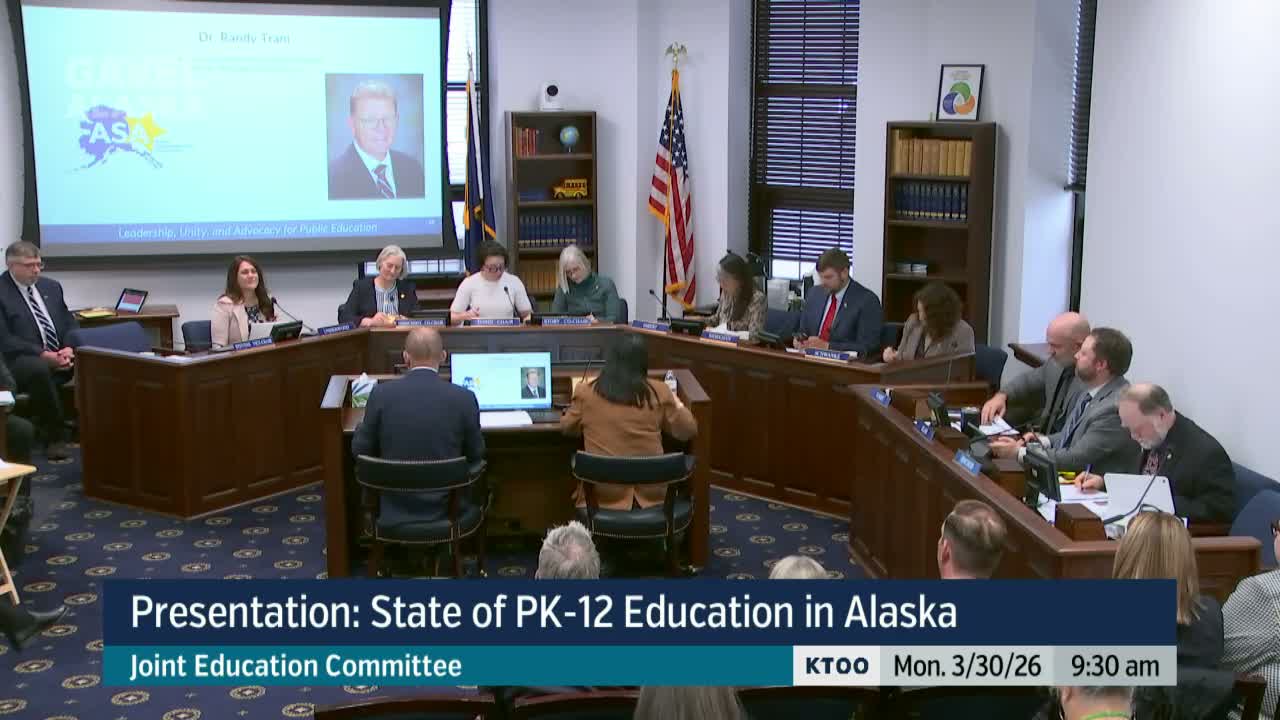 Katie Parrott, senior director of the Office of Management and Budget for Anchorage School District and president of the Alaska Association of School Business Officials (AASBO), and Randy Traini, president of the Alaska Superintendents Association, addressed school finance, transportation and facilities funding at the joint committee meeting.
