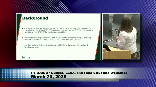 Edmond Economic Development Authority executive director Heather McDowell asked the City Council to increase the EDA’s FY 26–27 contract funding to about $1.1 million to pay for incentives, a CRM and consulting; the city manager recommended trimming the request toward $900,000 and asked staff and the EDA to refine allocations before the final budget.