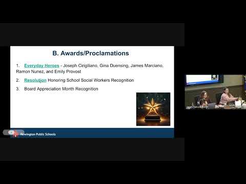 At the Newington Board of Education meeting on March 11, Ruth Chaffee staff led a short restorative-practices demonstration that featured student circle activities and teachers describing classroom benefits from a year of implementation.
