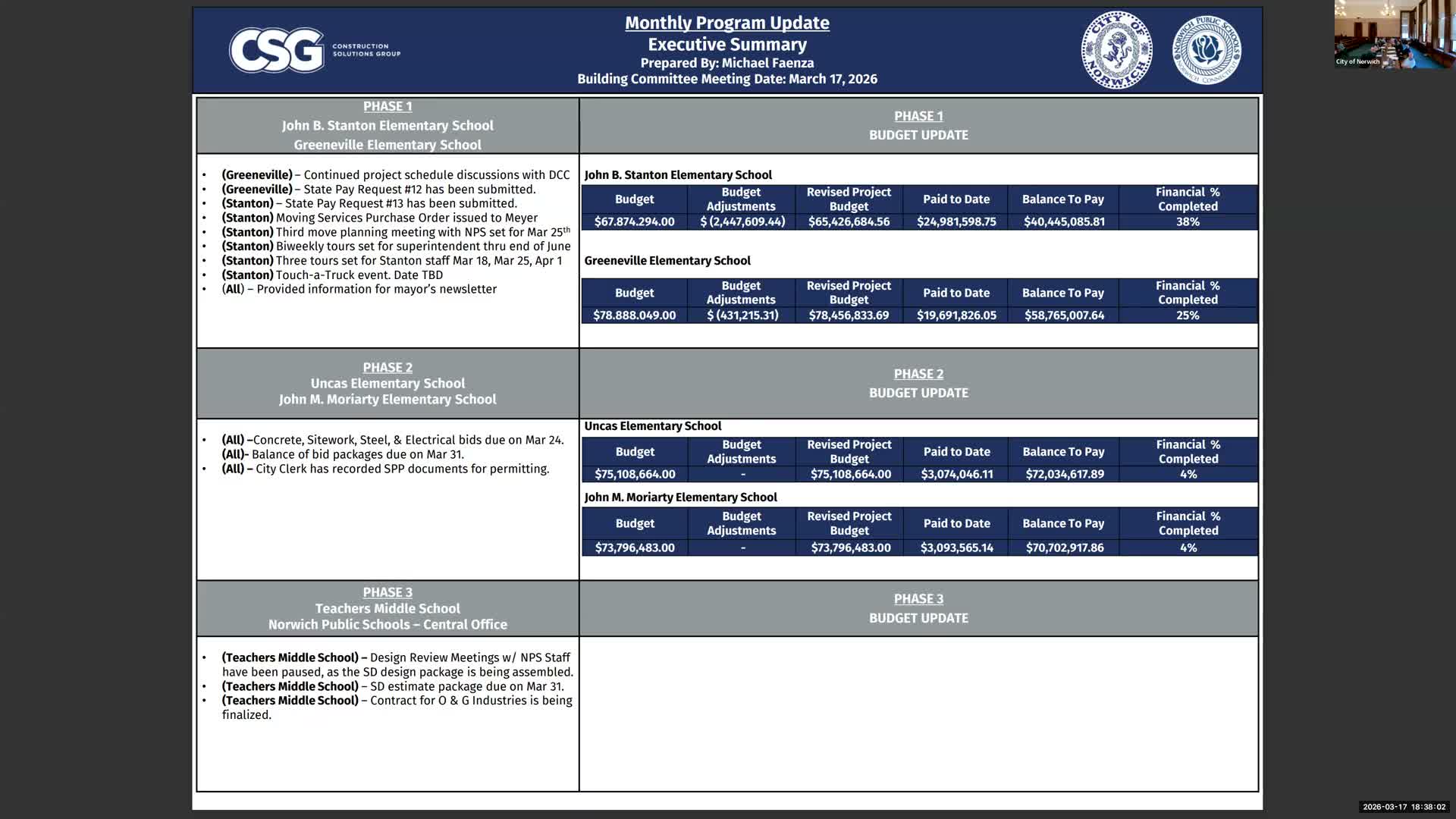 The Norwich Building Committee heard updates on construction progress across the district’s school projects, with staff and contractors describing recent milestones, schedule adjustments and public outreach plans.