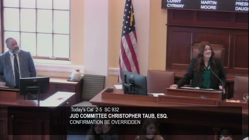 The Maine Senate took roll-call votes on multiple judicial nominations recommended by the Joint Standing Committee on Judiciary and sustained the committee recommendations, confirming the nominees named below.