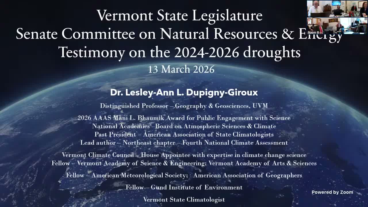 At a March 20 Senate Natural Resources & Energy hearing, a visiting professor and climatologist told the committee Vermont's 2025 drought set historic lows for groundwater, produced a rapid "flash drought," and left wells, farms and lakes at heightened risk; the witness urged improved local reporting and a multi-agency drought plan.