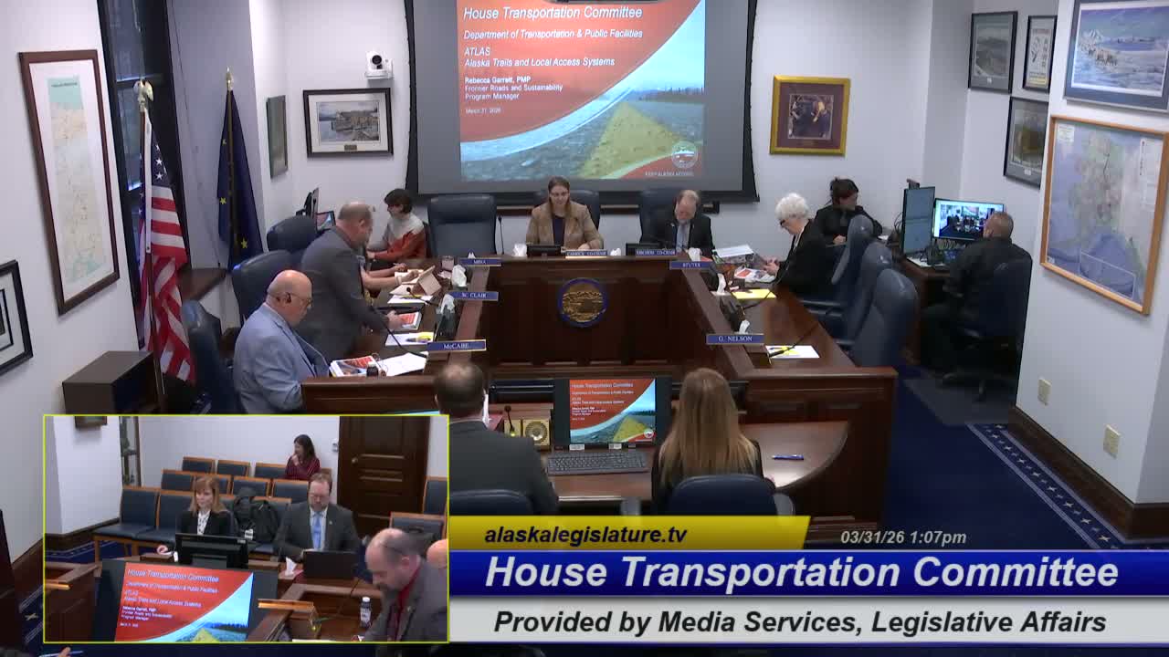 Rebecca Garrett of DOT&PF told the House Transportation Committee that Alaska Trails and Local Access Systems (ATLAS) — encompassing multiuse trails, ice roads, winter trail marking and snow-trail grooming — faces persistent demand that outstrips available funds, and asked legislators for predictable support to expand access in rural communities.