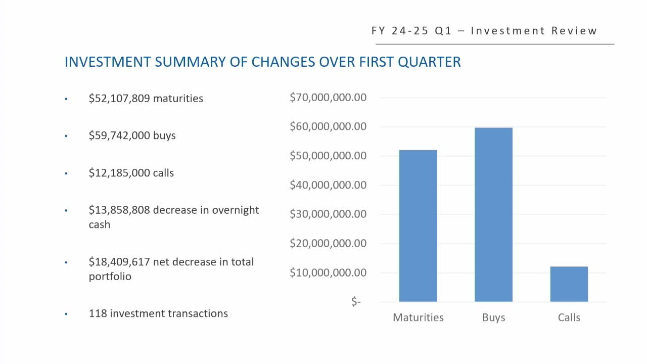The Investment Review Committee on Oct. 24 received its fiscal-year 2425 first-quarter investment review showing a net $18,400,000 decrease in the portfolio and a decline in pooled cash driven by the timing of property-tax receipts.