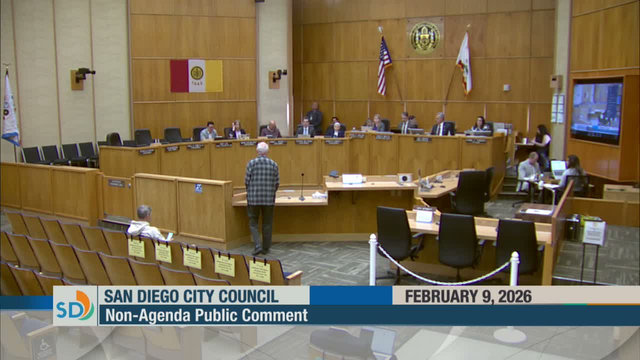 A broad range of public commenters used the Feb. 9 public‑comment periods to press the City Council on parking policy in Balboa Park, homelessness responses and oversight, outdoor marijuana billboard advertising, and the FY27 budget.