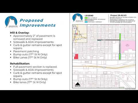 City presentation described a proposed 2026 rehabilitation and mill-and-overlay project on 4th Avenue North and 17th Street North, including sidewalk gap infill, bump-outs, bike lanes, an estimated $2.3 million price tag and roughly $460,000 in special assessments; residents were told how to subscribe for updates and request accommodations.