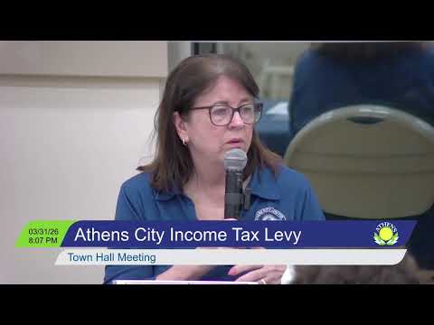 At a League of Women Voters town hall, Athens officials asked voters to approve a 0.2 percentage-point municipal income-tax increase estimated to generate about $1.9 million a year, saying the money would shore up employee health benefits and core services; they warned collections would begin in 2027 and the full effect may not be seen until 2028.