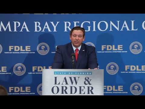 At a bill-signing at the Tampa Bay FDLE center, Governor DeSantis signed House Bill 445 and House Bill 1159, measures that require custody after conviction for certain offenses and expand penalties for child sexual-abuse material, including AI-generated content. Law-enforcement officials praised the measures and cited recent arrest statistics.