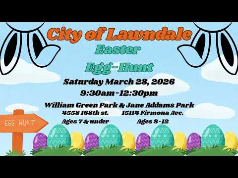 Lawndale City announced its annual Easter Egg Hunt, scheduled for Saturday, March 28, from 9:30 a.m. to 12:30 p.m. The event will include face painting, arts and crafts, music, photos and other activities. William Green Park will host children ages 7 and under; Jane Addams Park will host ages 8 to 12.