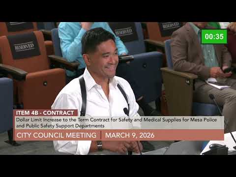 Council members voted to increase the dollar limit on a term contract for safety and medical supplies for the Mesa Police and Public Safety Support Department and separately approved the replacement of 200 ballistic helmets for the police department. Public commenter Reggie Braun urged the council to prioritize investigative and counseling resources over tactical gear, saying some items in the police purchases look more like militarized equipment than medical supplies.