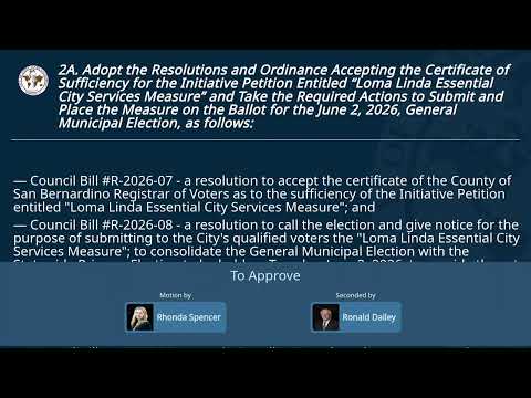 The Loma Linda City Council voted to accept the San Bernardino Registrar of Voters' certification of the "Loma Linda Essential City Services Measure," to place it on the June 2, 2026 consolidated ballot and to introduce an implementing ordinance on first reading. The council also approved a $50,000 supplemental appropriation to cover election and ROV administration costs after heated public comment about legal defects.