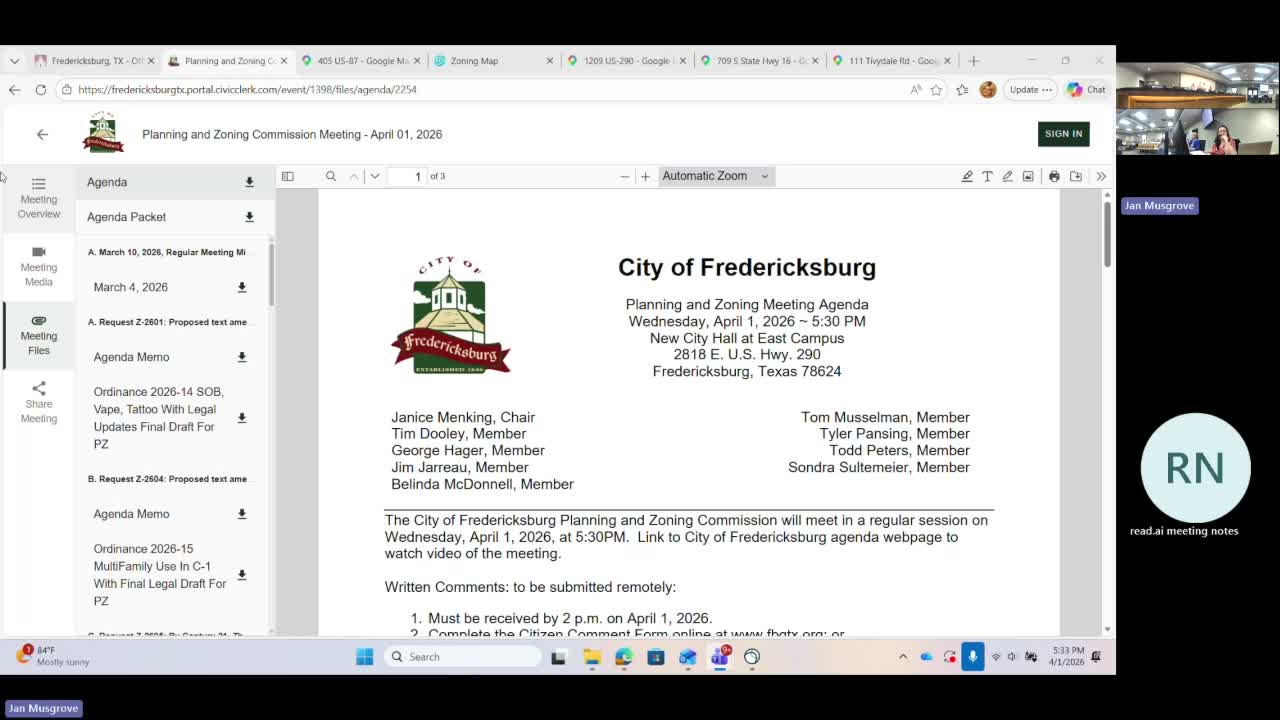 The Fredericksburg Planning & Zoning Commission on an evening hearing approved a package of zoning changes aimed at directing where vape shops, tattoo studios, game‑of‑skill parlors and similar uses may locate, sent the amendment to City Council, denied an application by Century 21 to operate as a standardized business in the Historic Shopping District, approved conditional use permits for a cat café and a drive‑through associated with a retail/dry‑cleaning use, amended sidewalk standards for commercial corridors, and tabled a site‑plan review until revised engineering materials are provided.