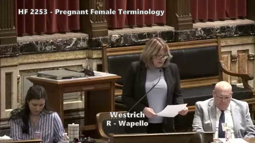 Senator Westrich (Senator from Wafula) presented House file 22 53 as a "simple targeted terminology update" that replaces the phrase "pregnant person" with "pregnant female" in four specific sections of Iowa Code concerning serious crimes, including feticide, assault causing miscarriage, and injury to a pregnant mother. Sponsor comments framed the change as a clarification to make application easier for prosecutors, judges and juries.