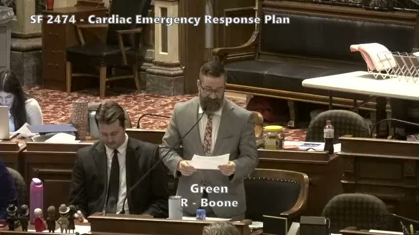 Senator Green (Senator from Boone) said Senate file 24 74 "comes to us from the Heart Association" and "directs the Department of Education to collect data in regards to defibrillators in school buildings and as well assess, and gather data for our schools' existing emergency plans specific to cardiac arrest or similar life threatening emergencies." He said the Department of Education shall submit the report to the General Assembly by Jan. 15, 2027.