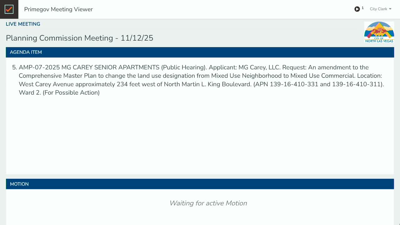 Staff described items 5 and 6 as a comprehensive-master-plan land-use amendment and a rezoning to allow a multifamily, 55-and-older residential development with about 3,000 square feet of ground-floor commercial space. Alex Gonzales, a principal with MG Carey LLC, said the project is intended as senior apartments (55+), with gated parking, a covered bus stop provided in coordination with RTC and small-scale commercial uses such as a hair salon or coffee shop to serve residents.
