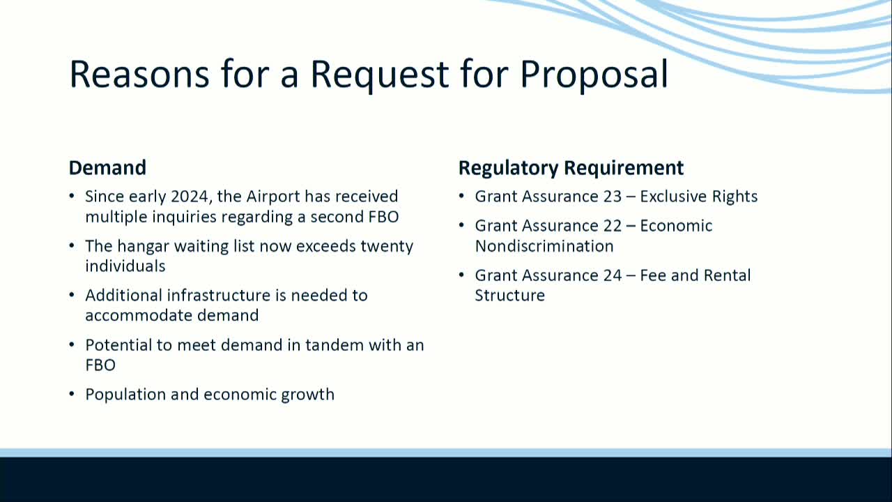 Airport staff told the council the airport has growing hangar demand and a waiting list of more than 20; staff proposed issuing an RFP this summer for a second fixed-base operator (FBO) with evaluation criteria that emphasize financial capability, compliance with FAA grant assurances and long-term commitment.